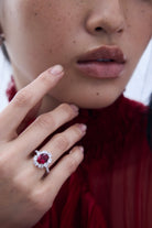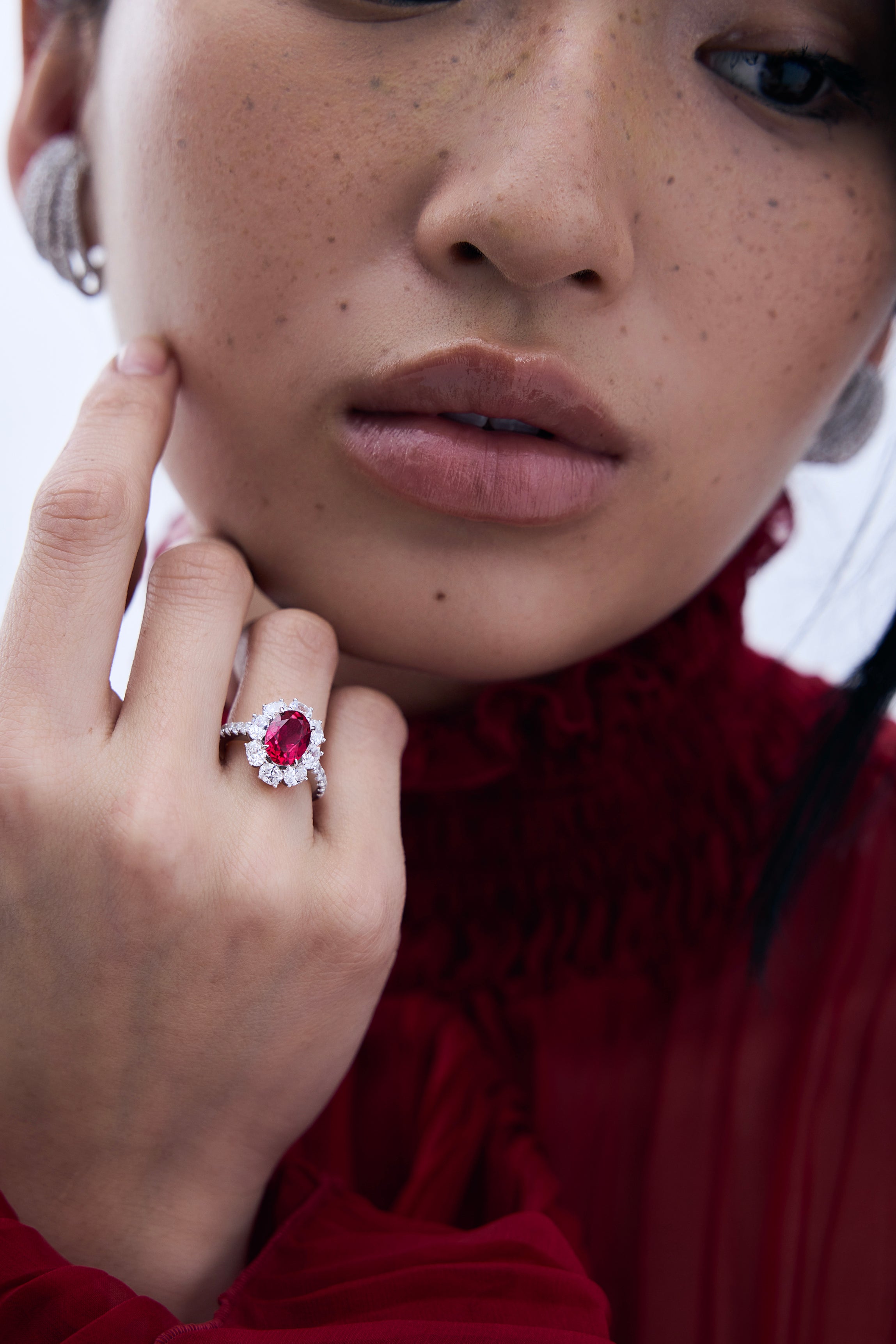 A radiant ruby-hued center stone is framed by delicate brilliance, creating a refined contrast that feels powerful yet timeless.