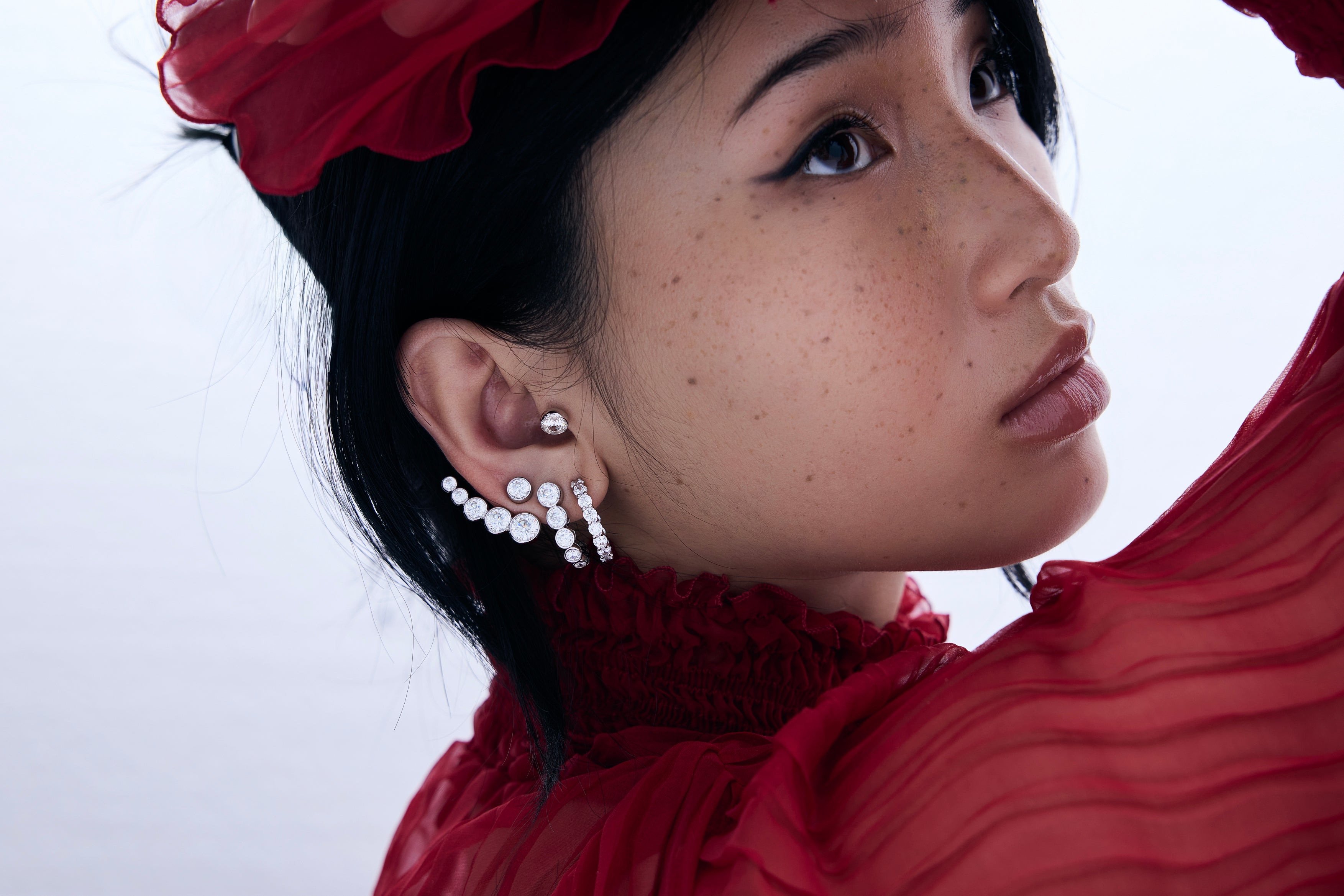 The curved line of luminous stones frames the face beautifully, creating soft movement and effortless sophistication.