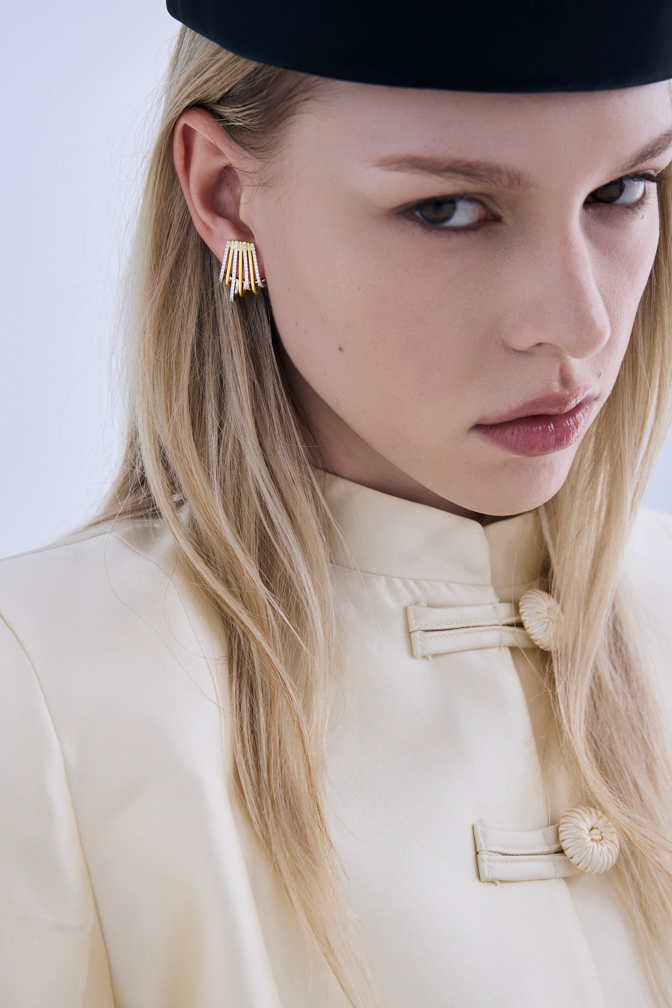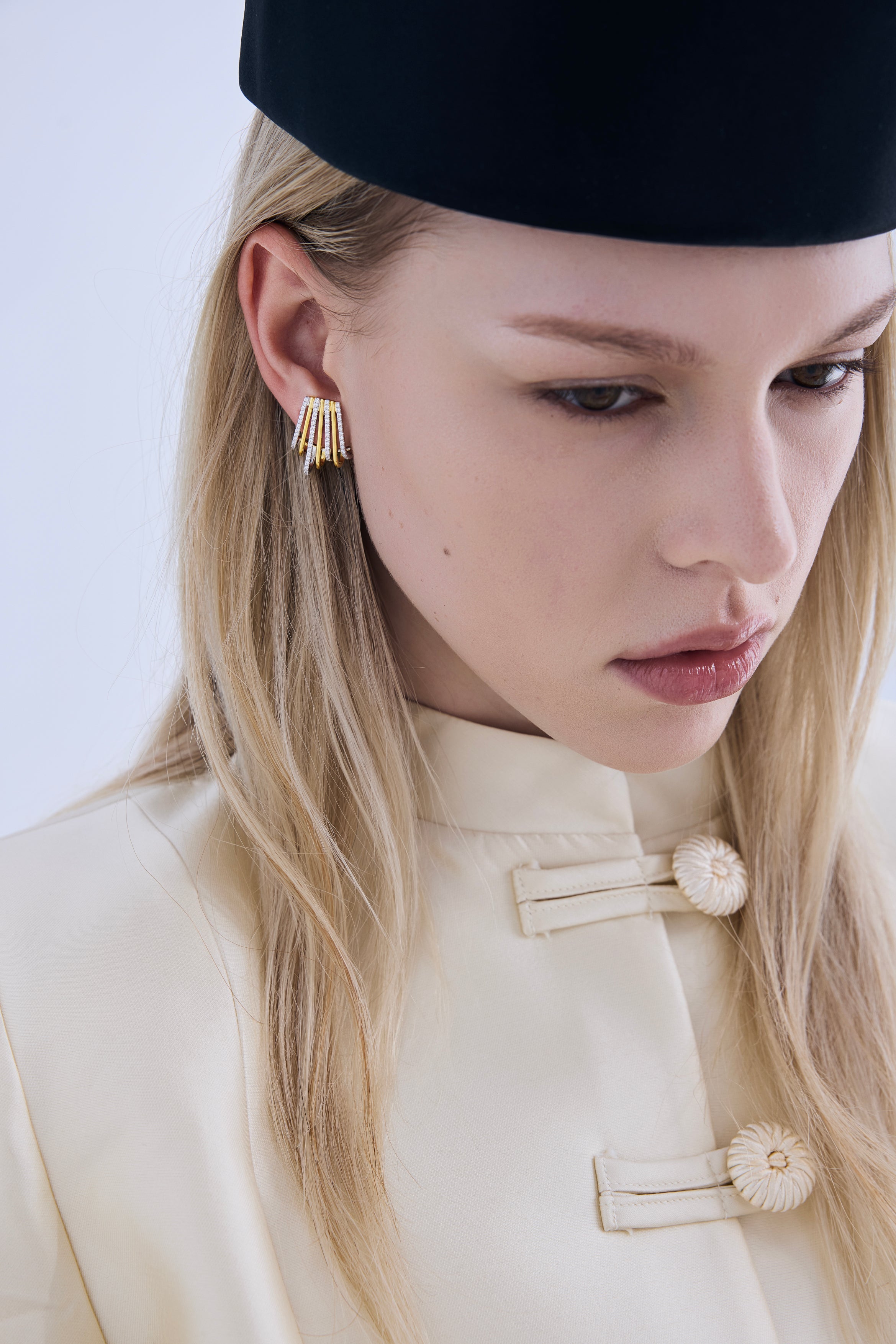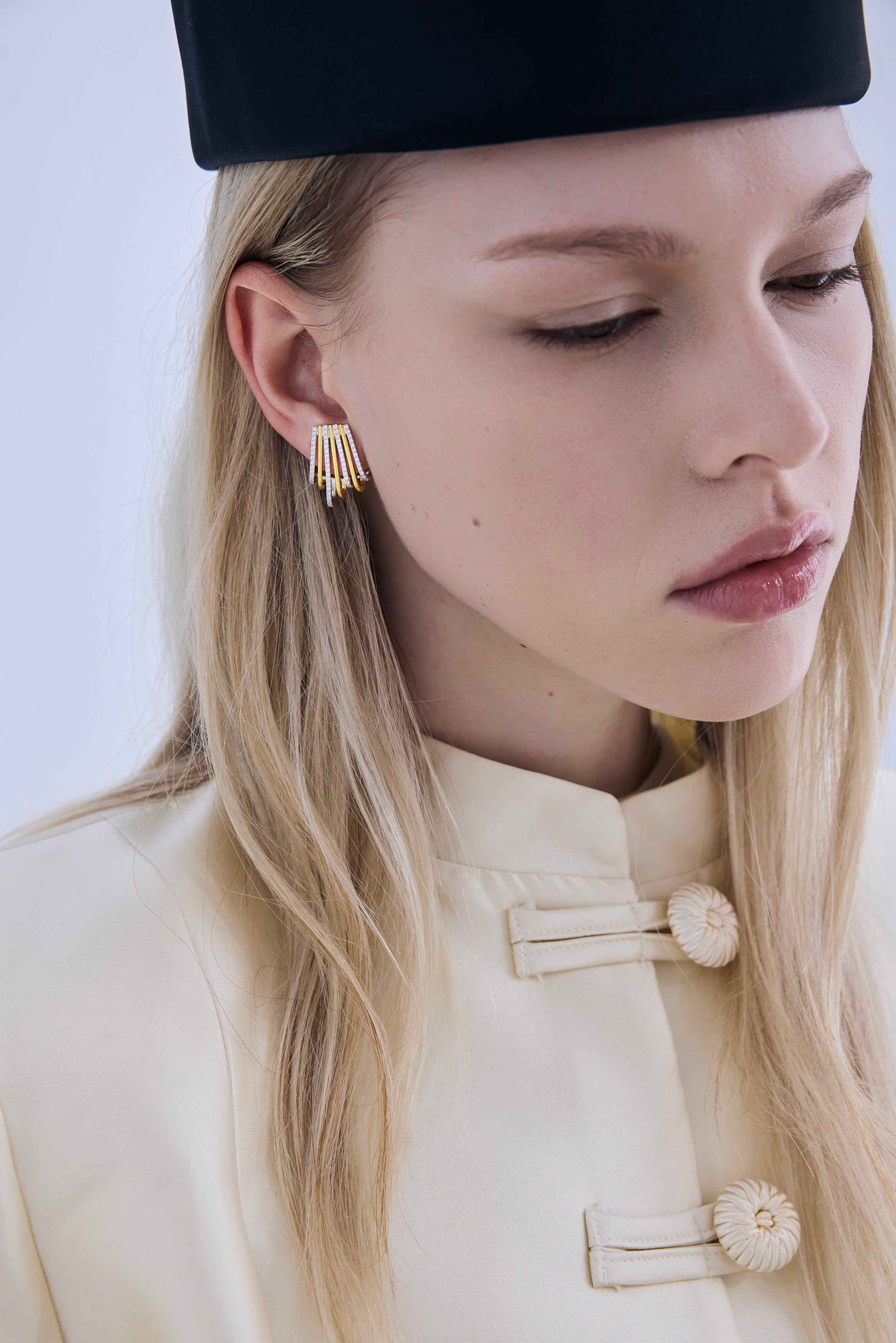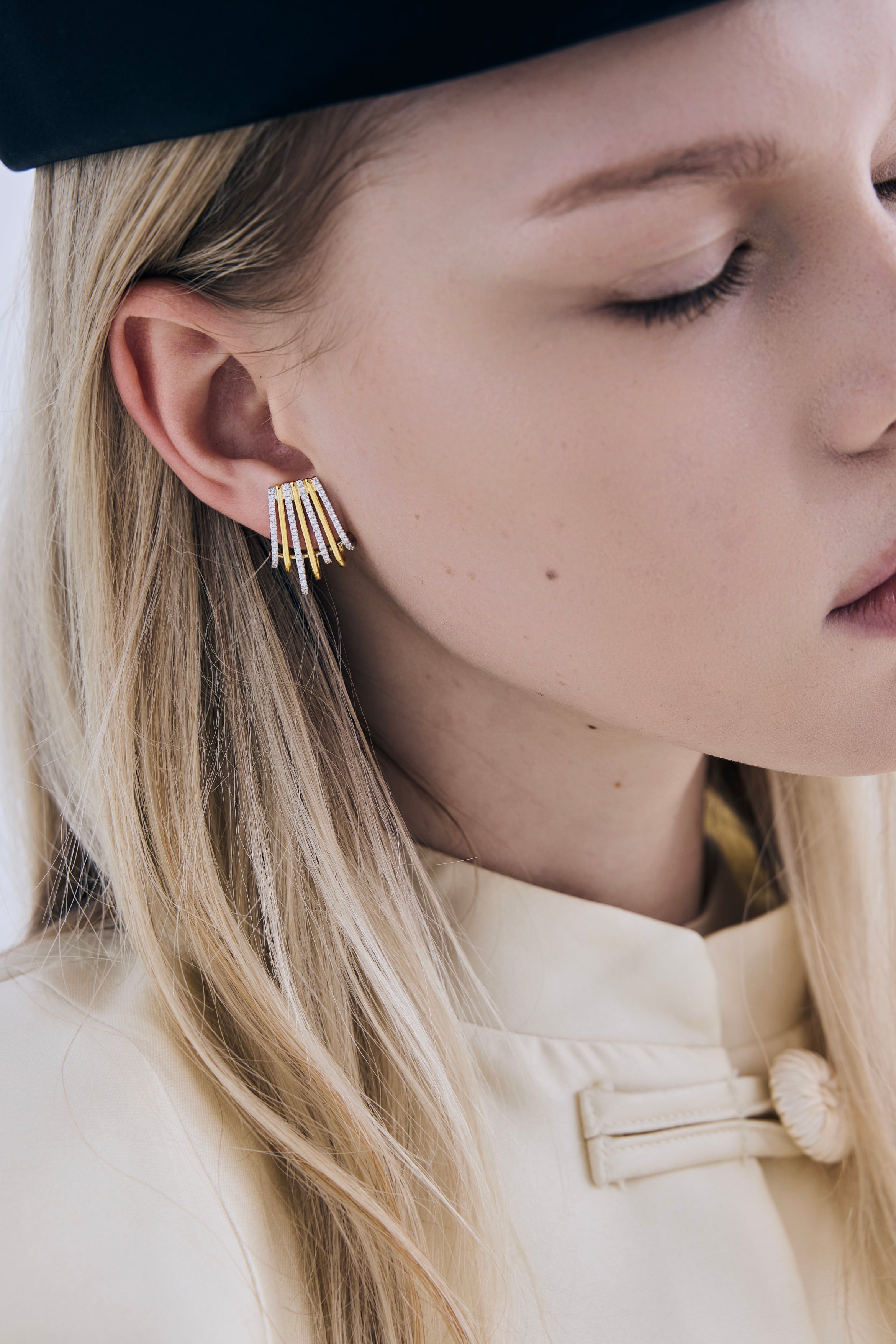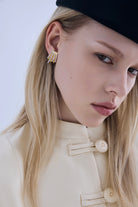 The EUPHORIA earrings feature a sculptural, fan-inspired silhouette designed in a refined two-tone finish. The interplay of gold and silver tones creates depth, dimension, and a modern architectural feel.