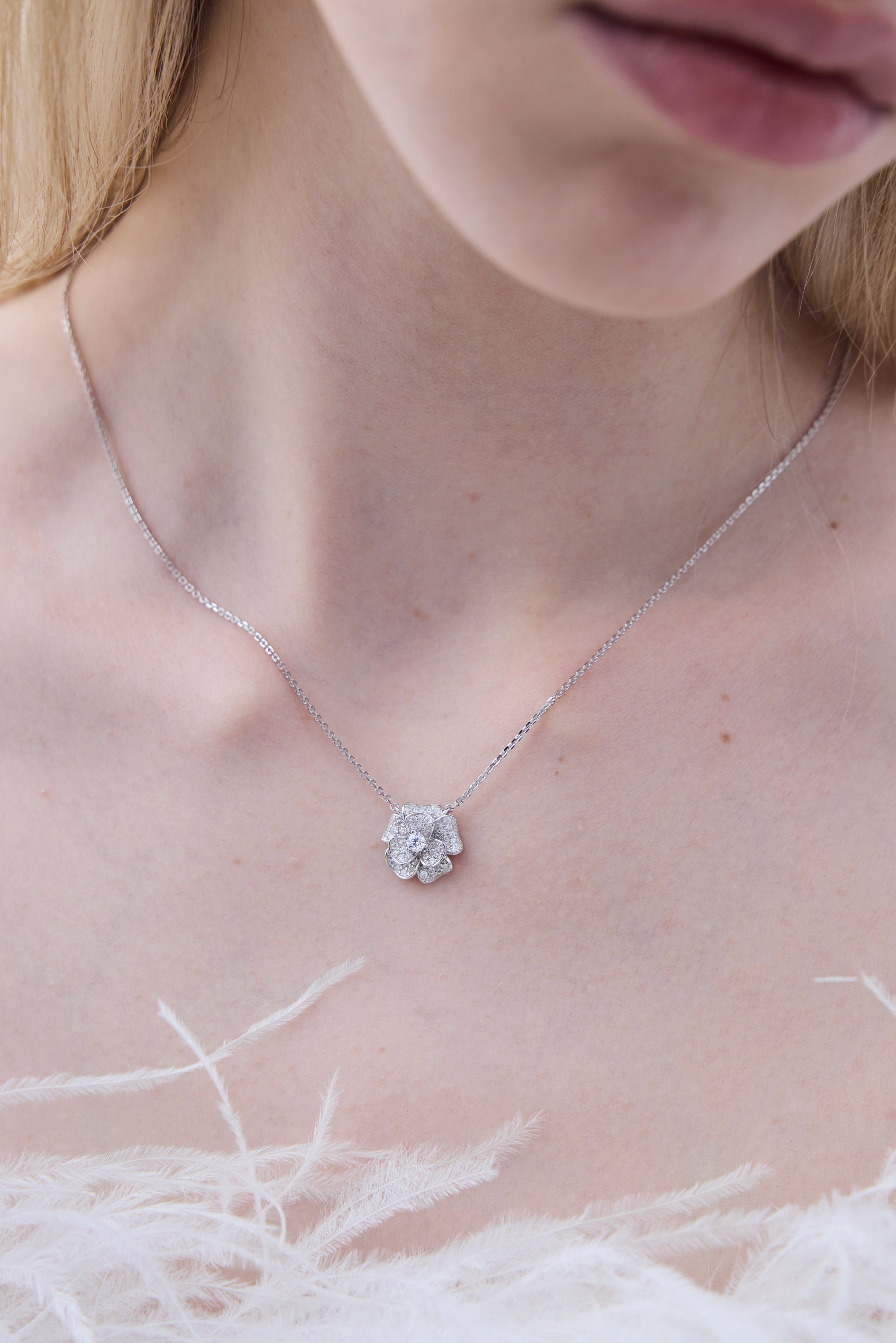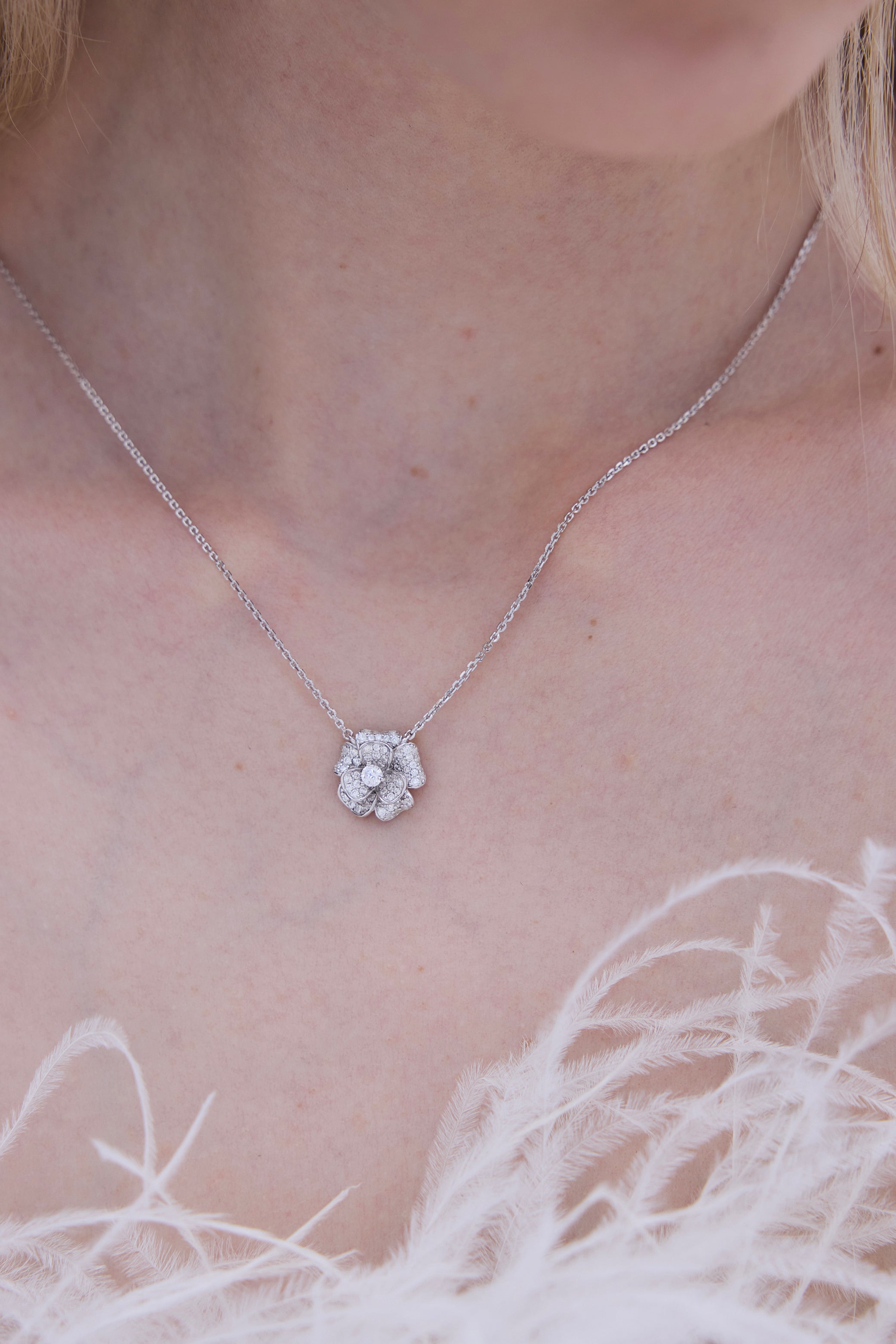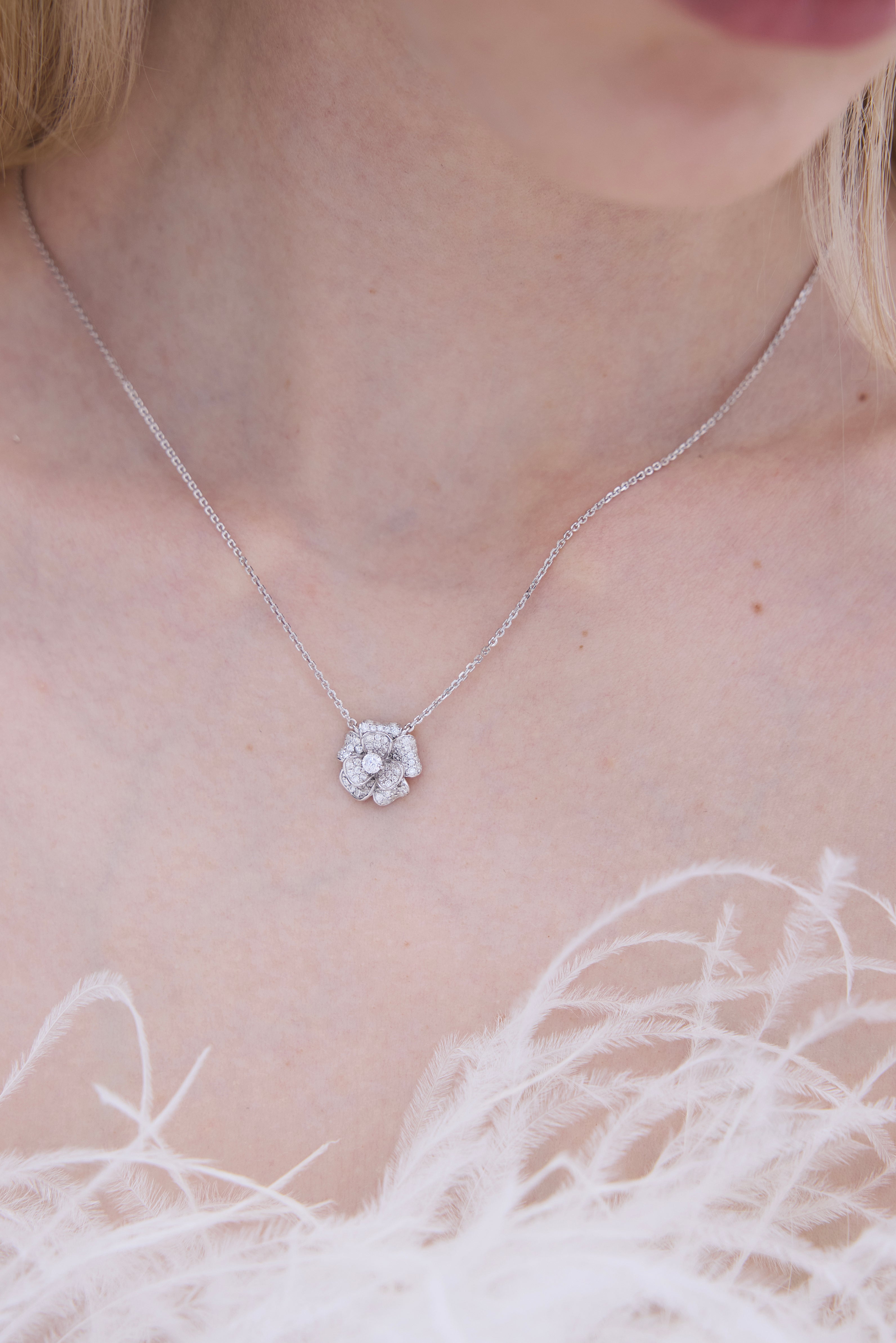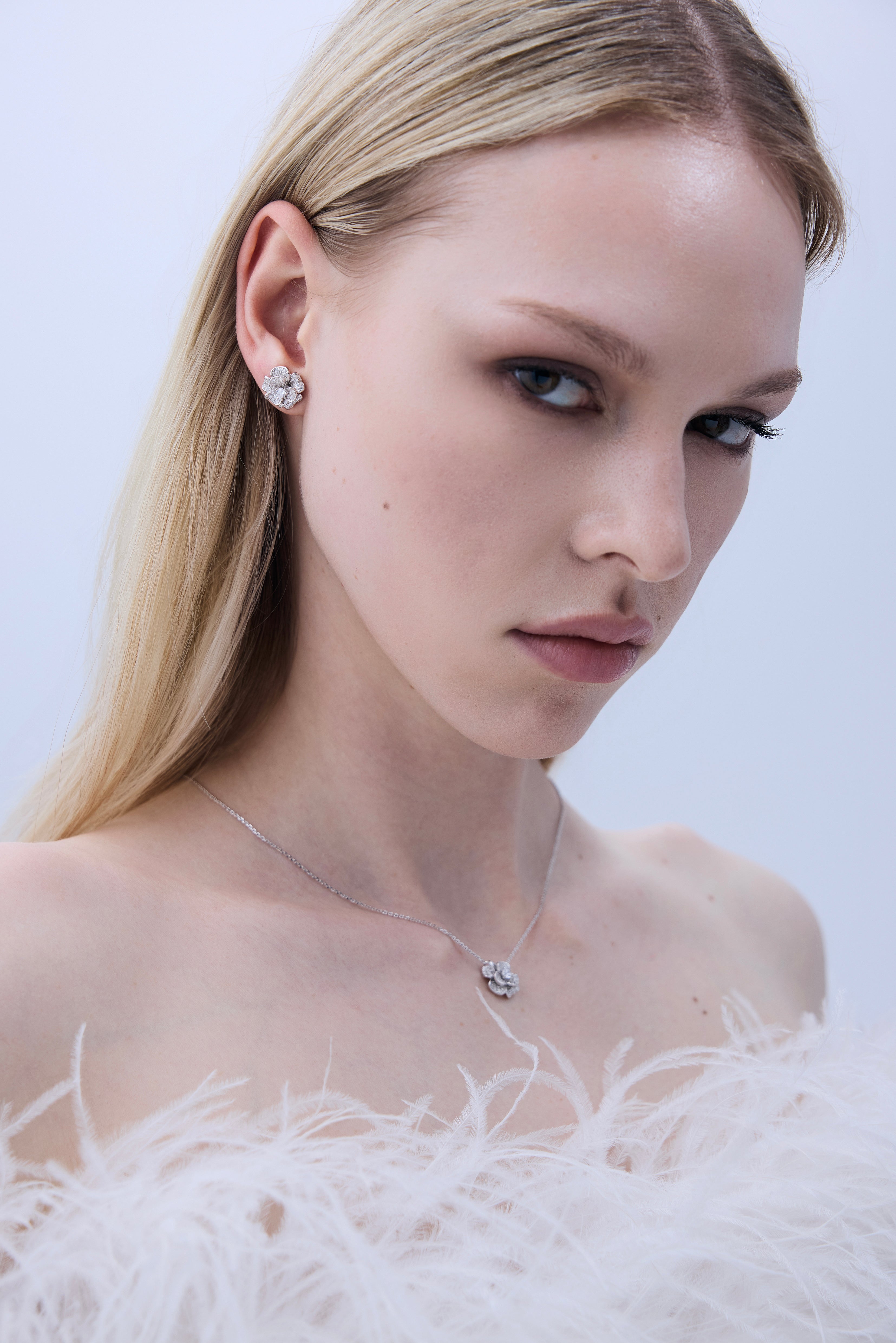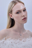 The PARIS earrings feature a sculptural floral silhouette, delicately formed to reflect light from every angle. Paired with the matching necklace, designed to sit softly along the collarbone, the set creates a harmonious statement that feels both subtle and unforgettable.