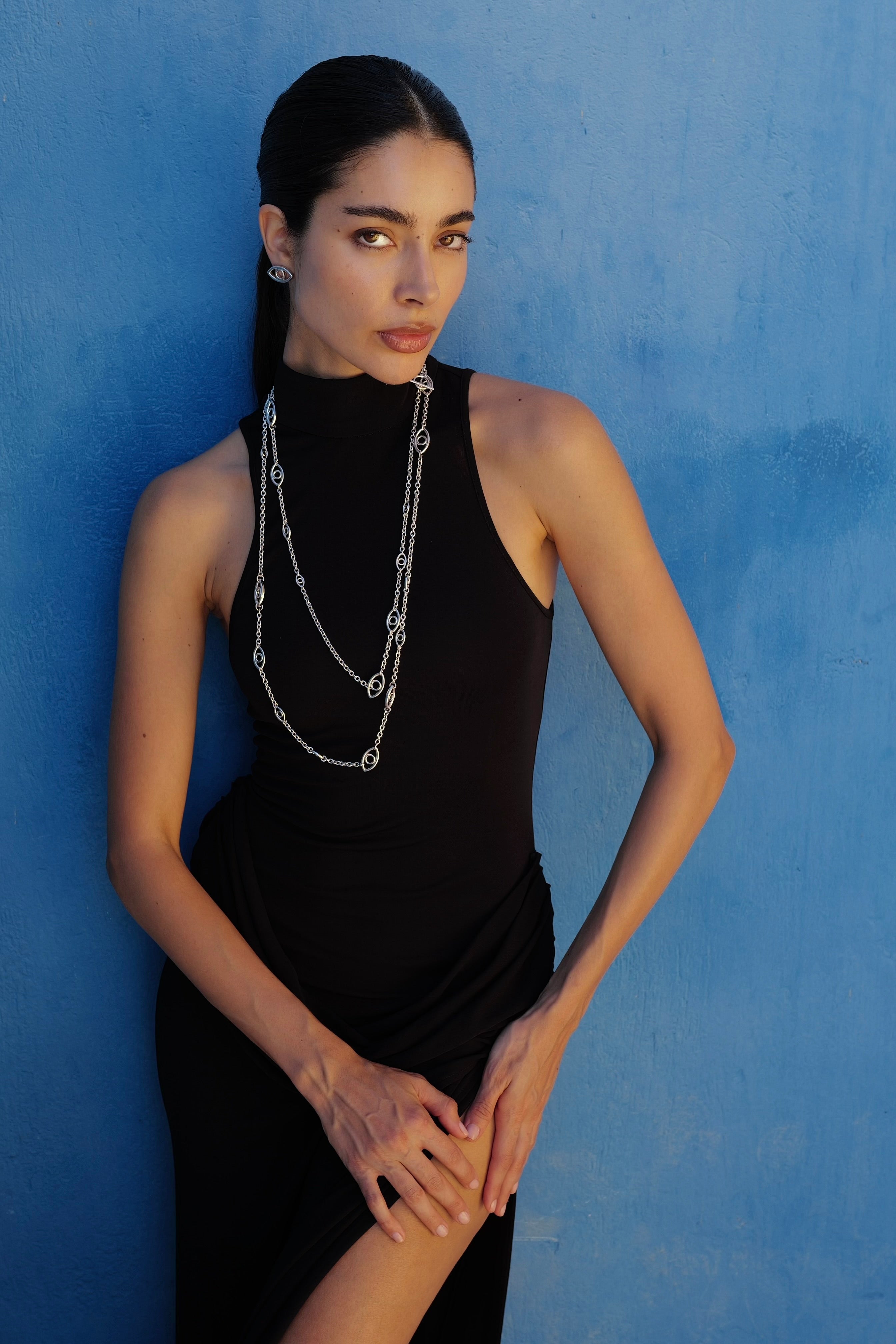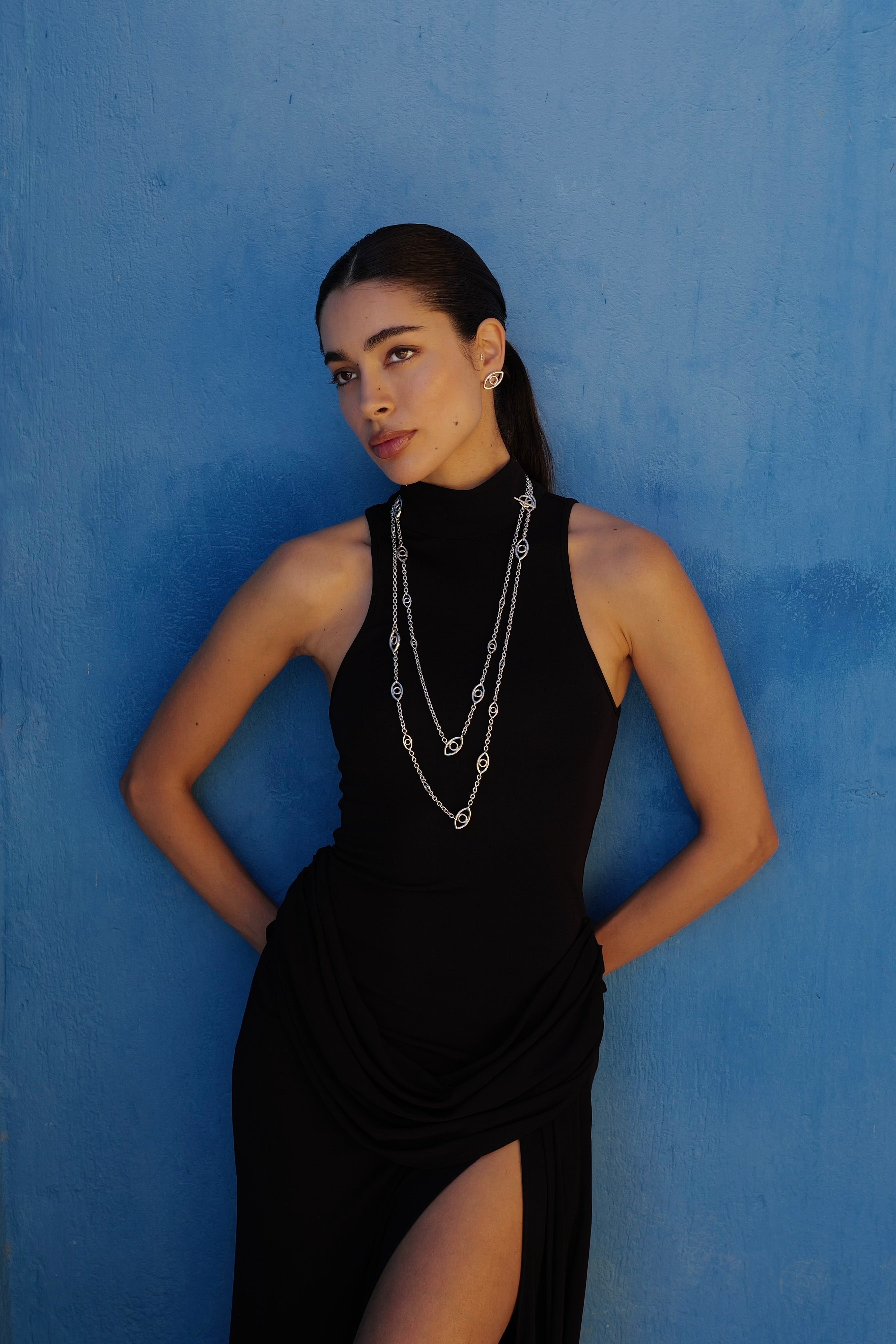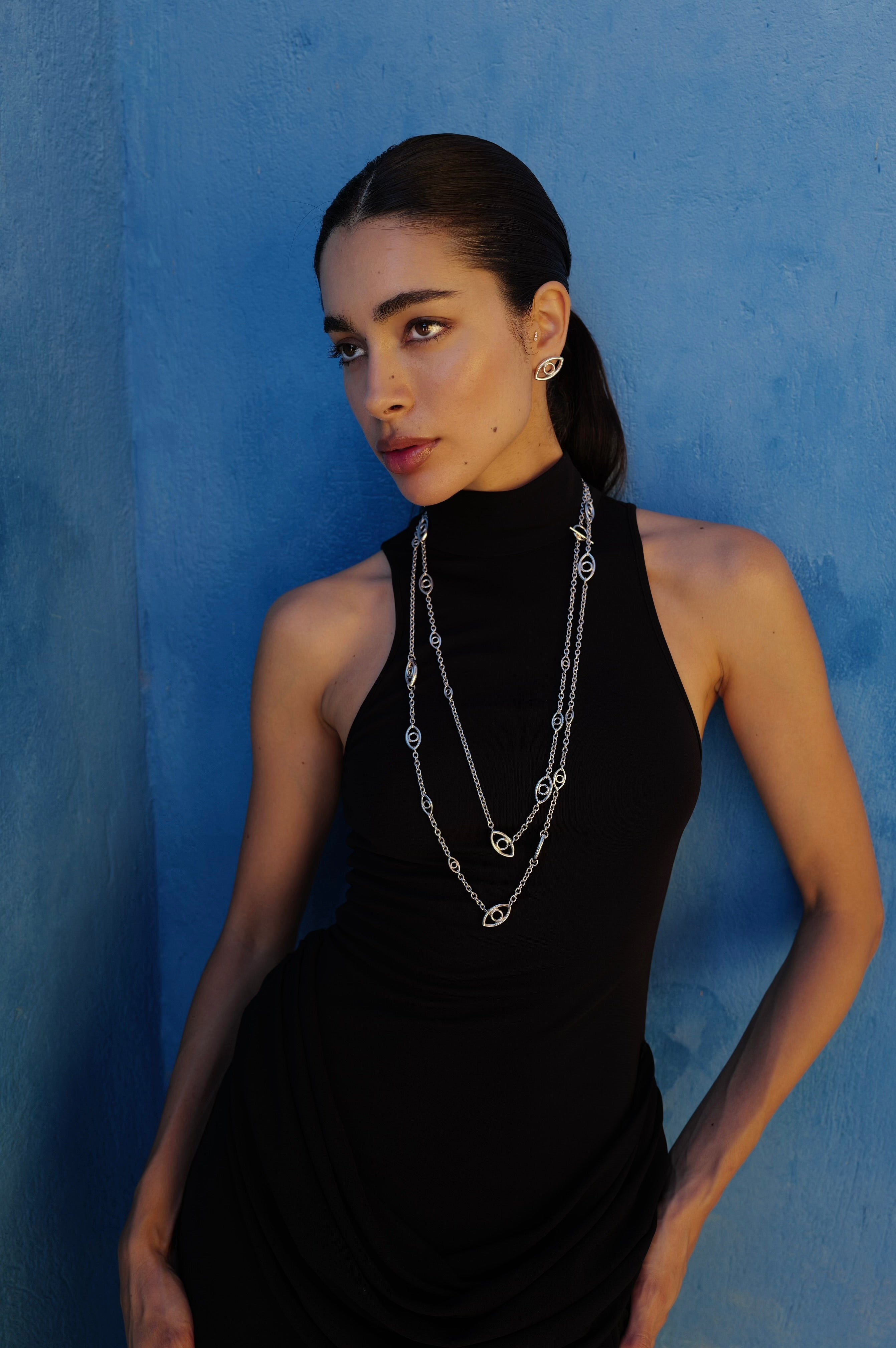 Mystique is an iconic jewelry set consisting of a statement necklace and bold matching earrings—each one crafted around the powerful symbol of the eye. Designed and inspired by Maria Leka, this piece was created with the belief that beauty should also protect.