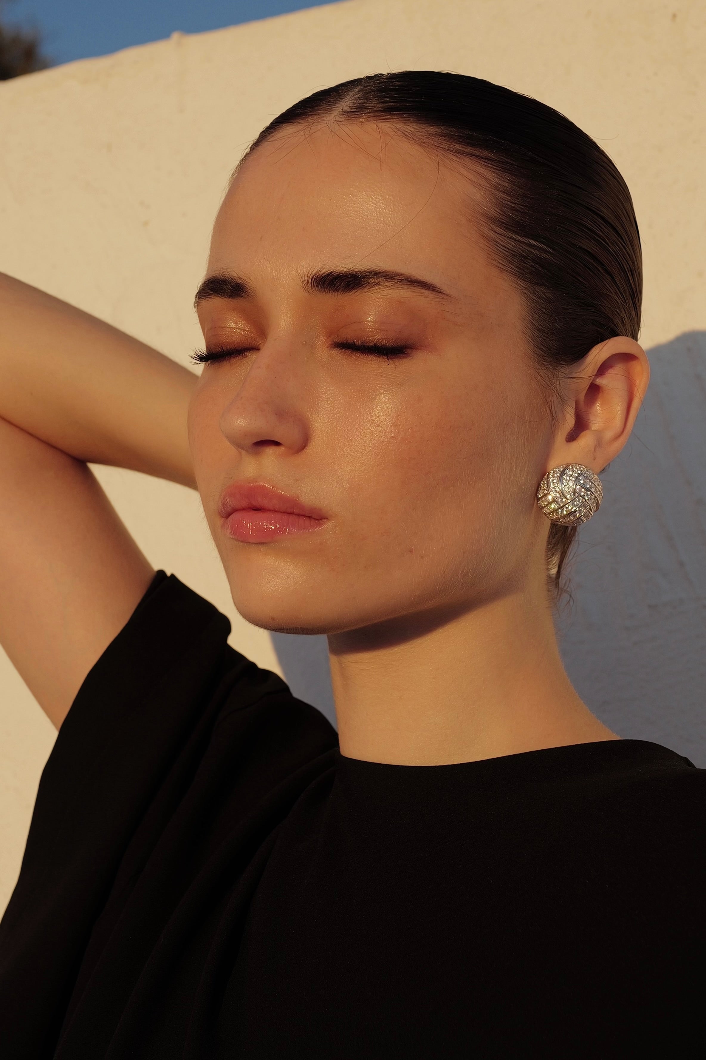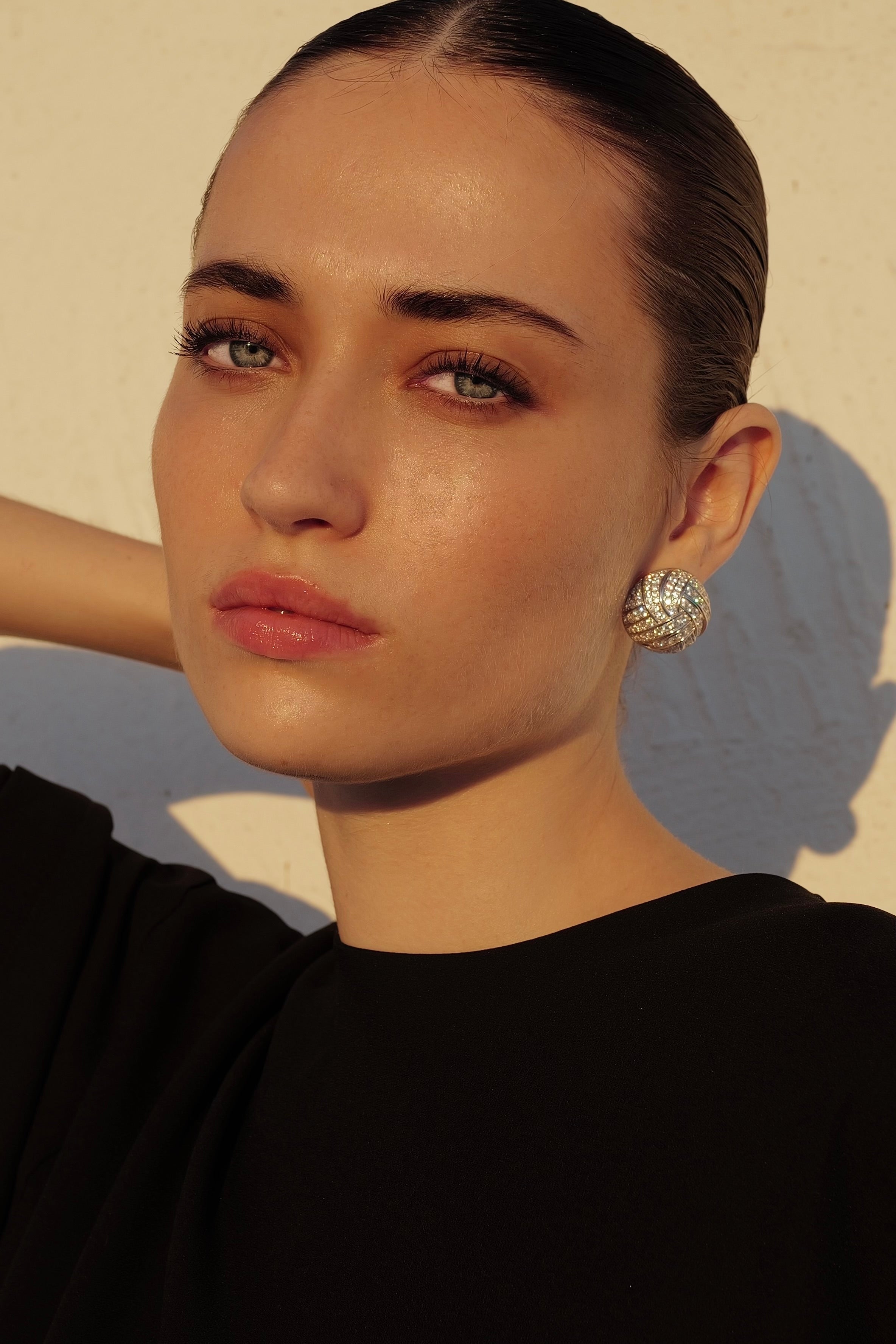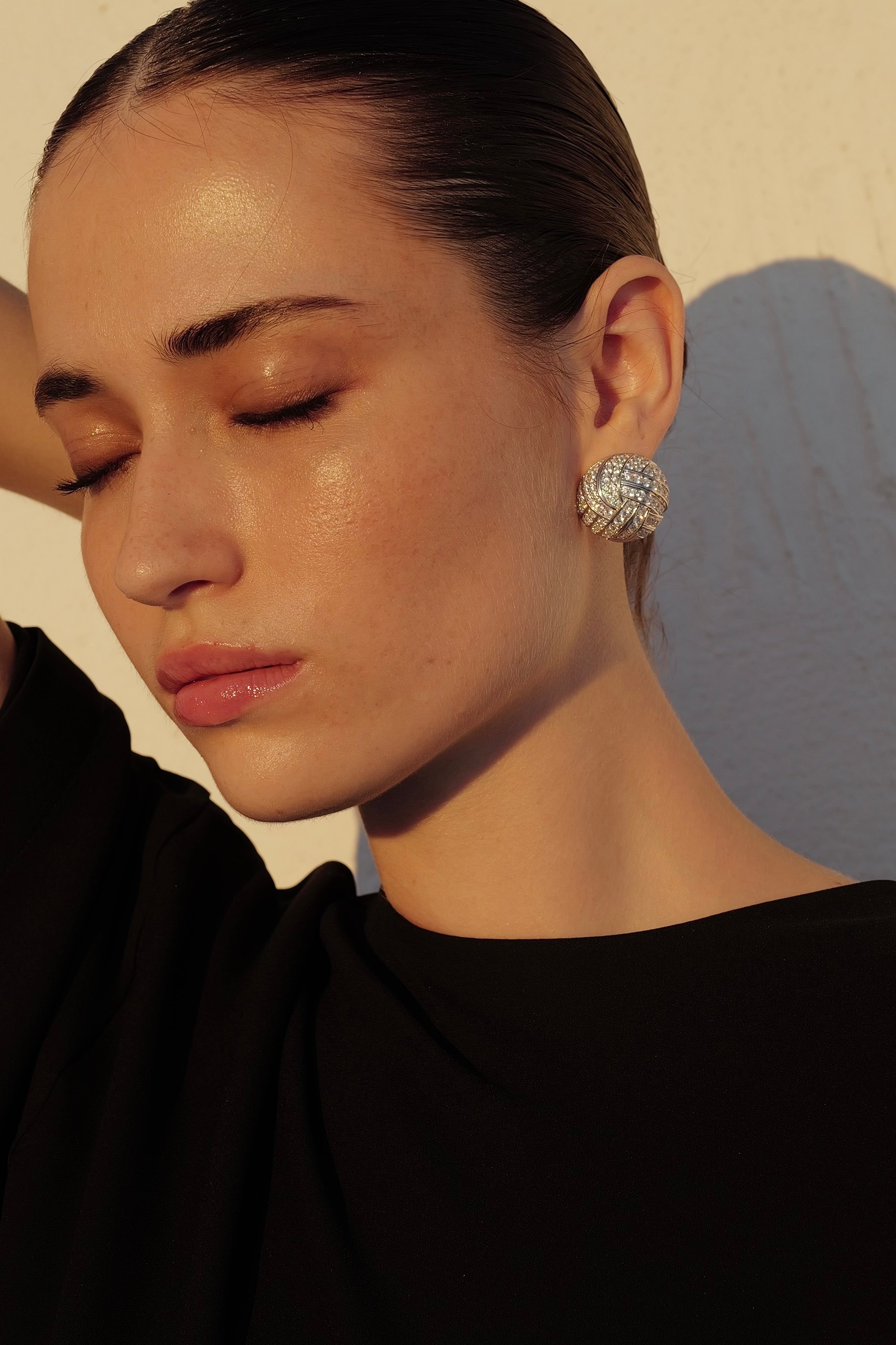 A sculptural tribute to vintage elegance, the Andros earrings radiate a quiet grandeur. Their bold, domed silhouette is intricately set with shimmering stones that catch and reflect the light with every turn — evoking the soft, sunlit architecture of the Aegean. Designed to command attention without saying a word, they are a statement of timeless sophistication.