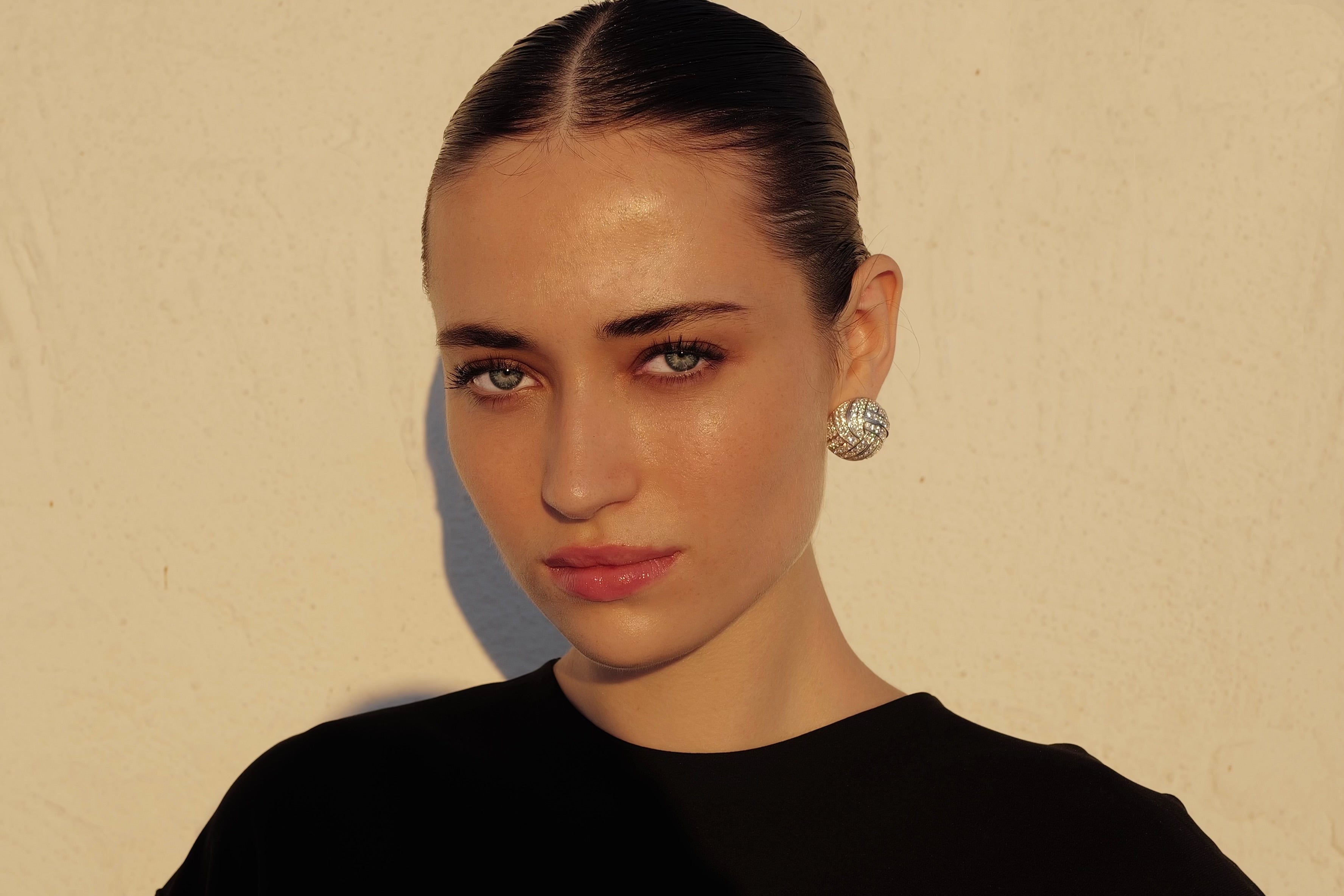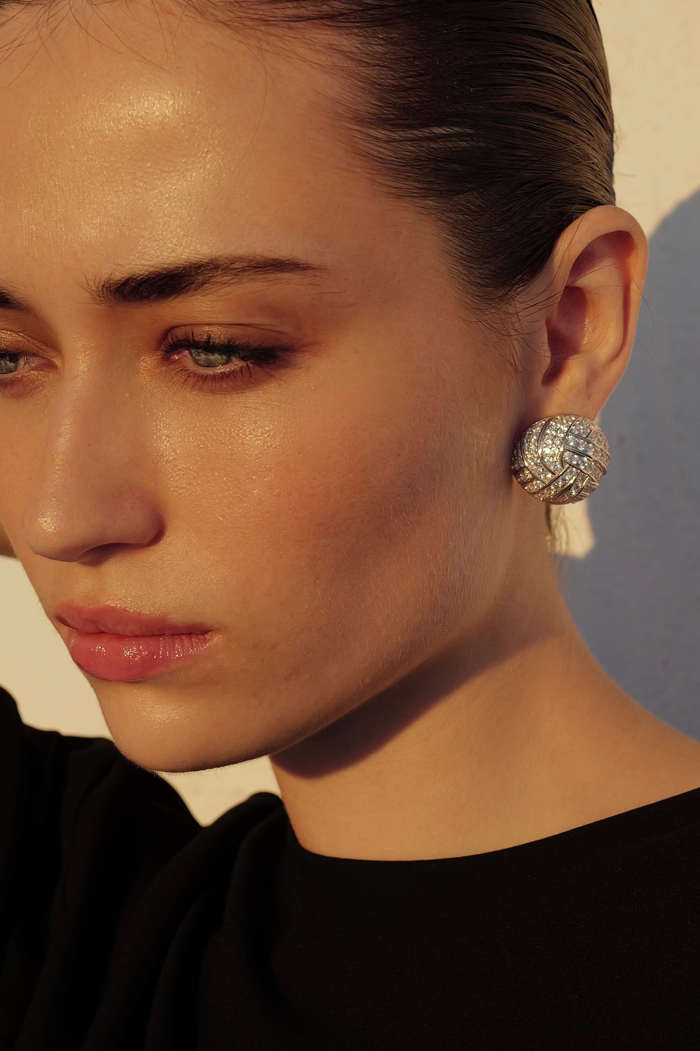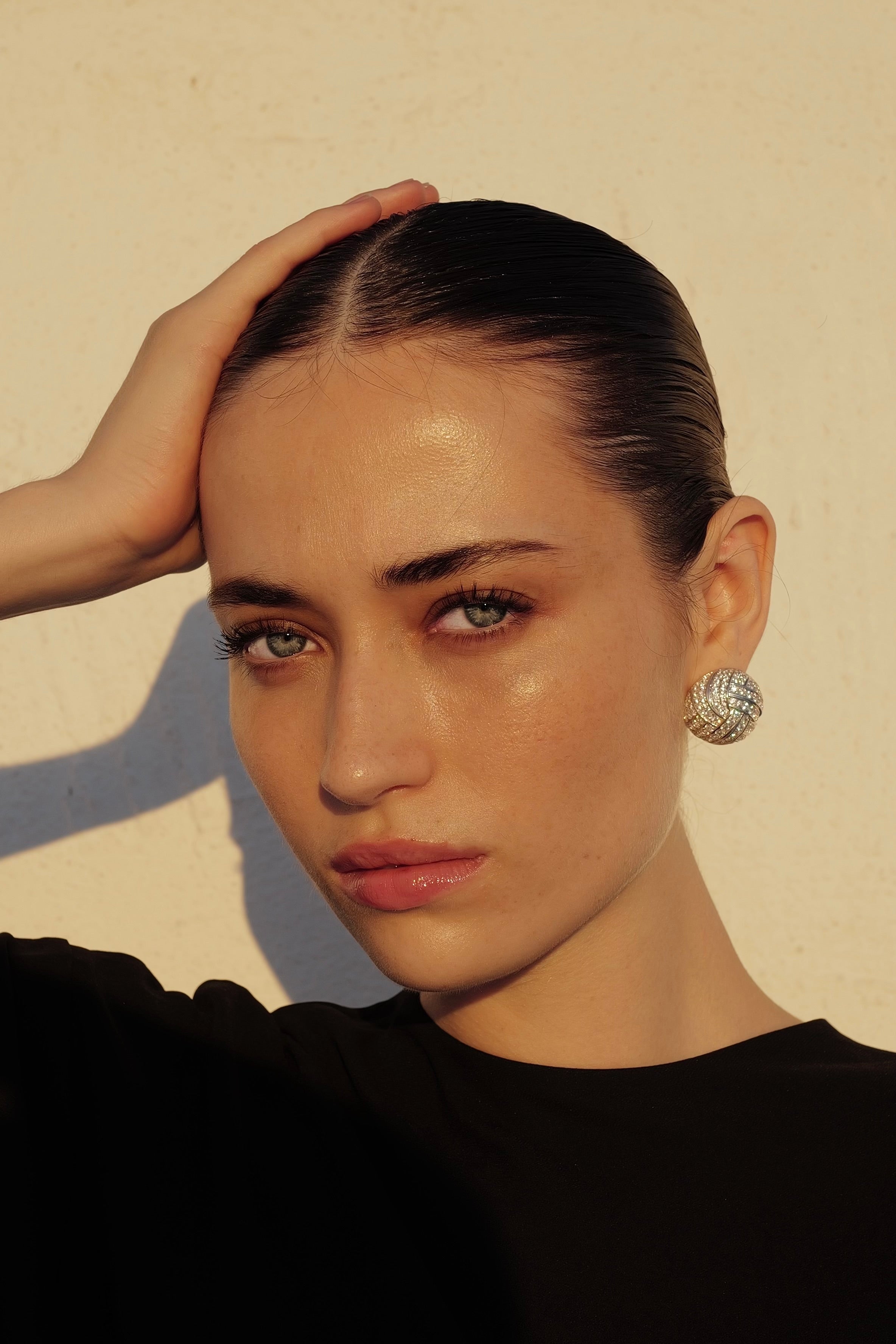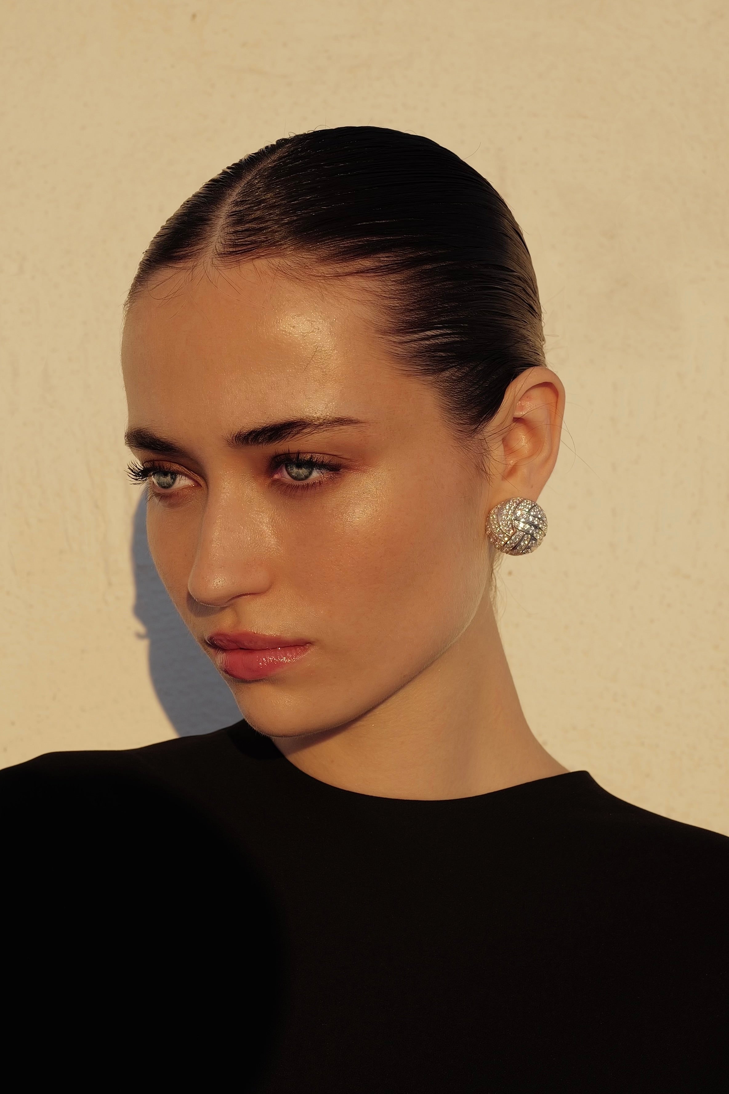 A sculptural tribute to vintage elegance, the Andros earrings radiate a quiet grandeur. Their bold, domed silhouette is intricately set with shimmering stones that catch and reflect the light with every turn — evoking the soft, sunlit architecture of the Aegean. Designed to command attention without saying a word, they are a statement of timeless sophistication.
