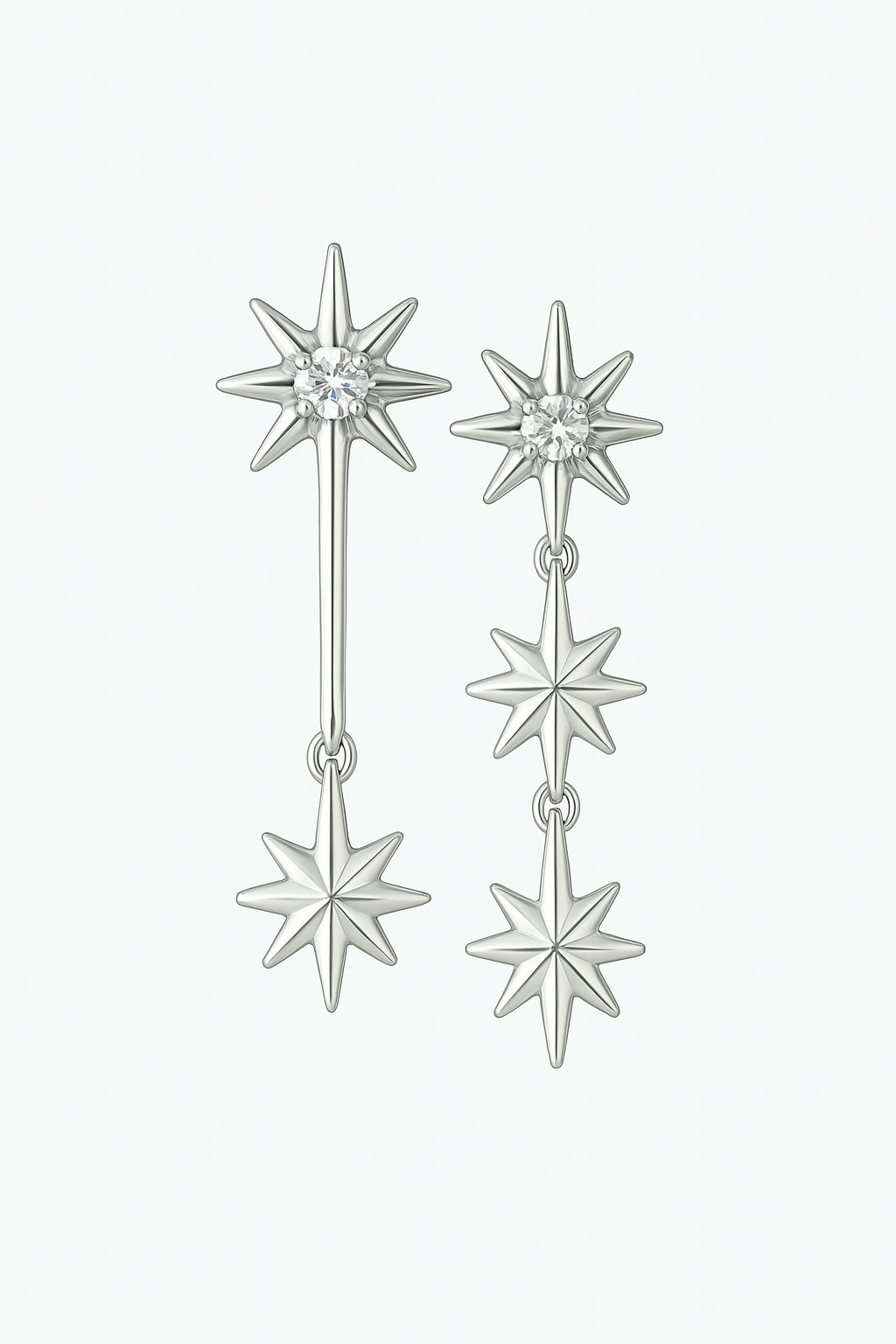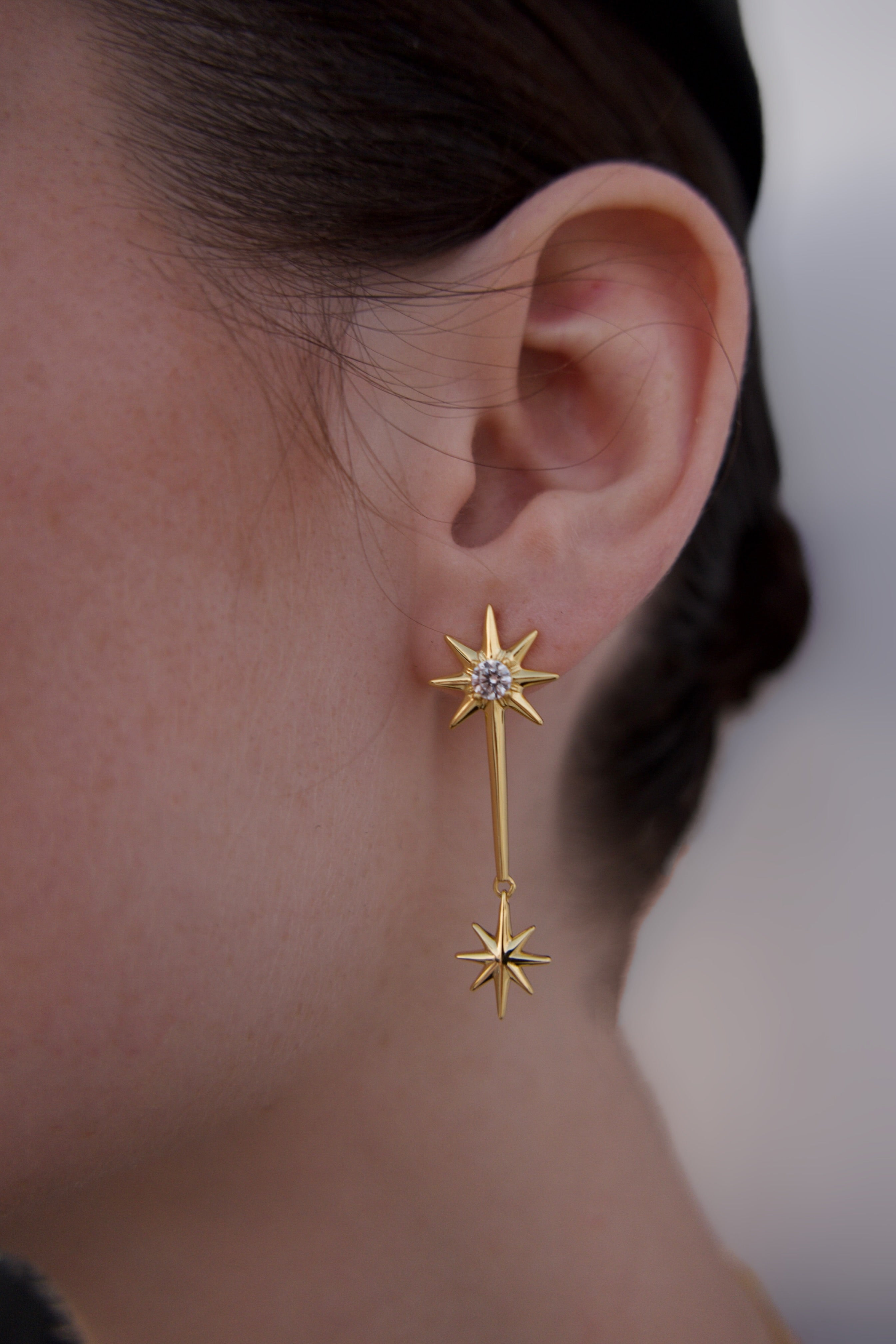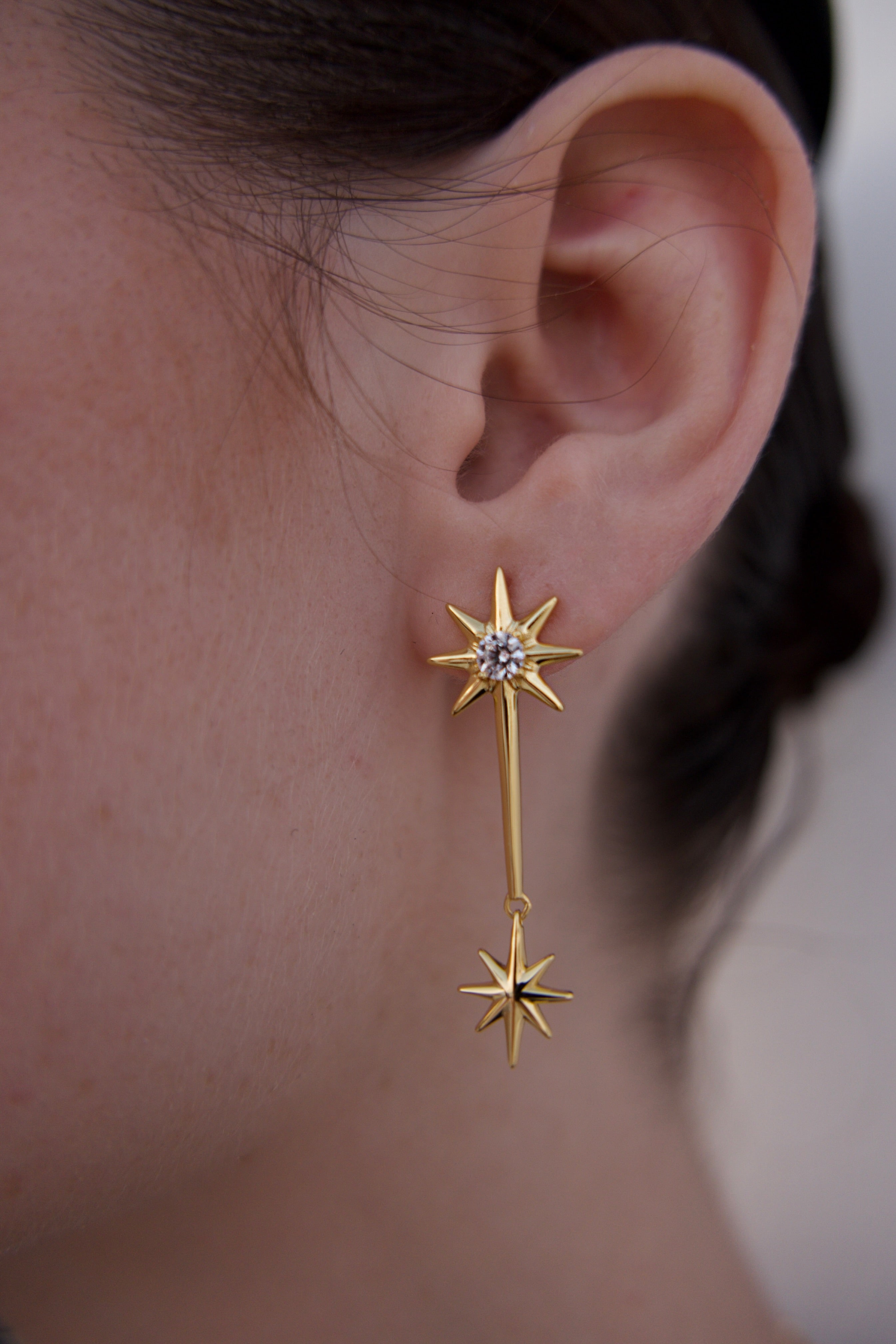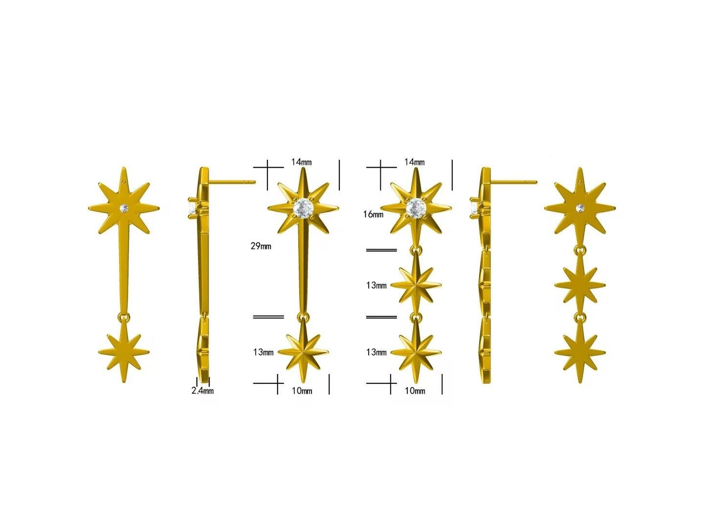 Each set features two different earrings, designed to complement yet contrast—one with cascading stars, the other more minimal and sharp. This asymmetry adds a unique character to your look, making Galaxies a true conversation piece.