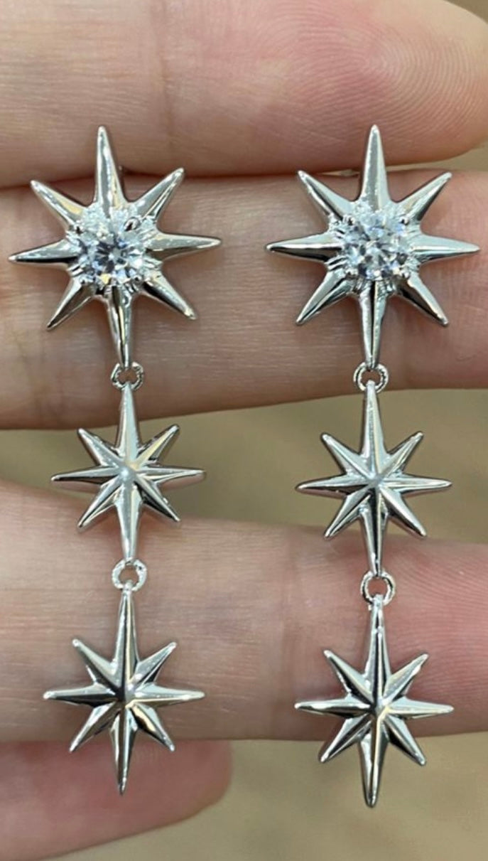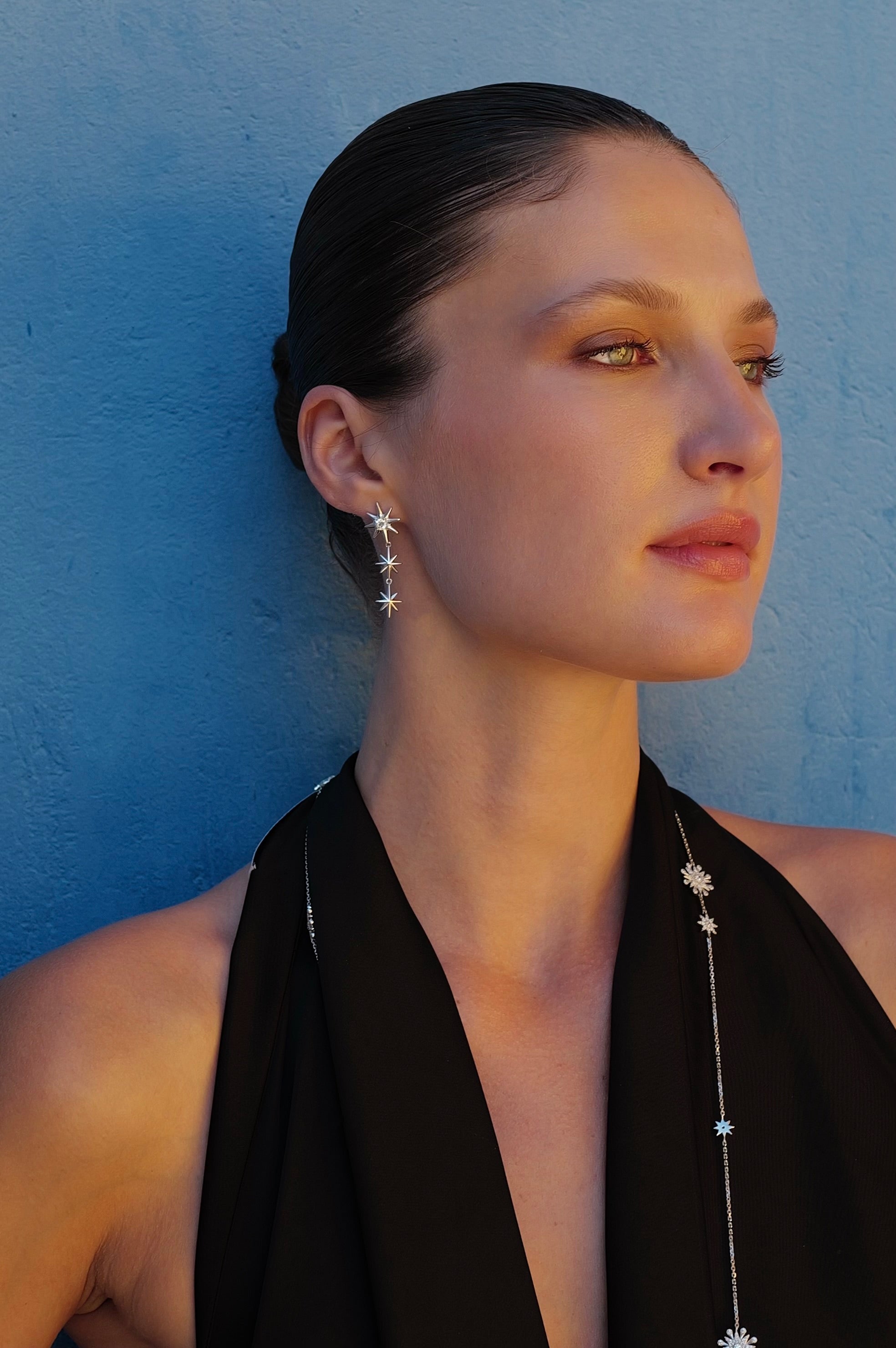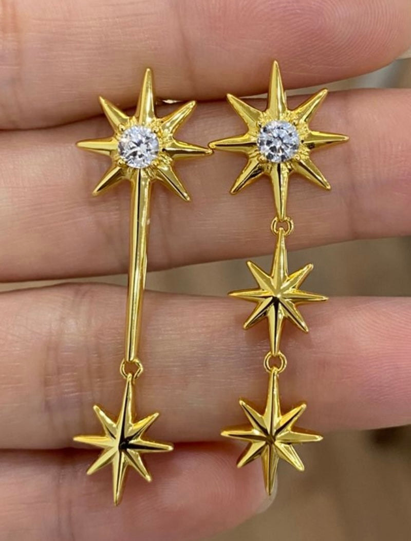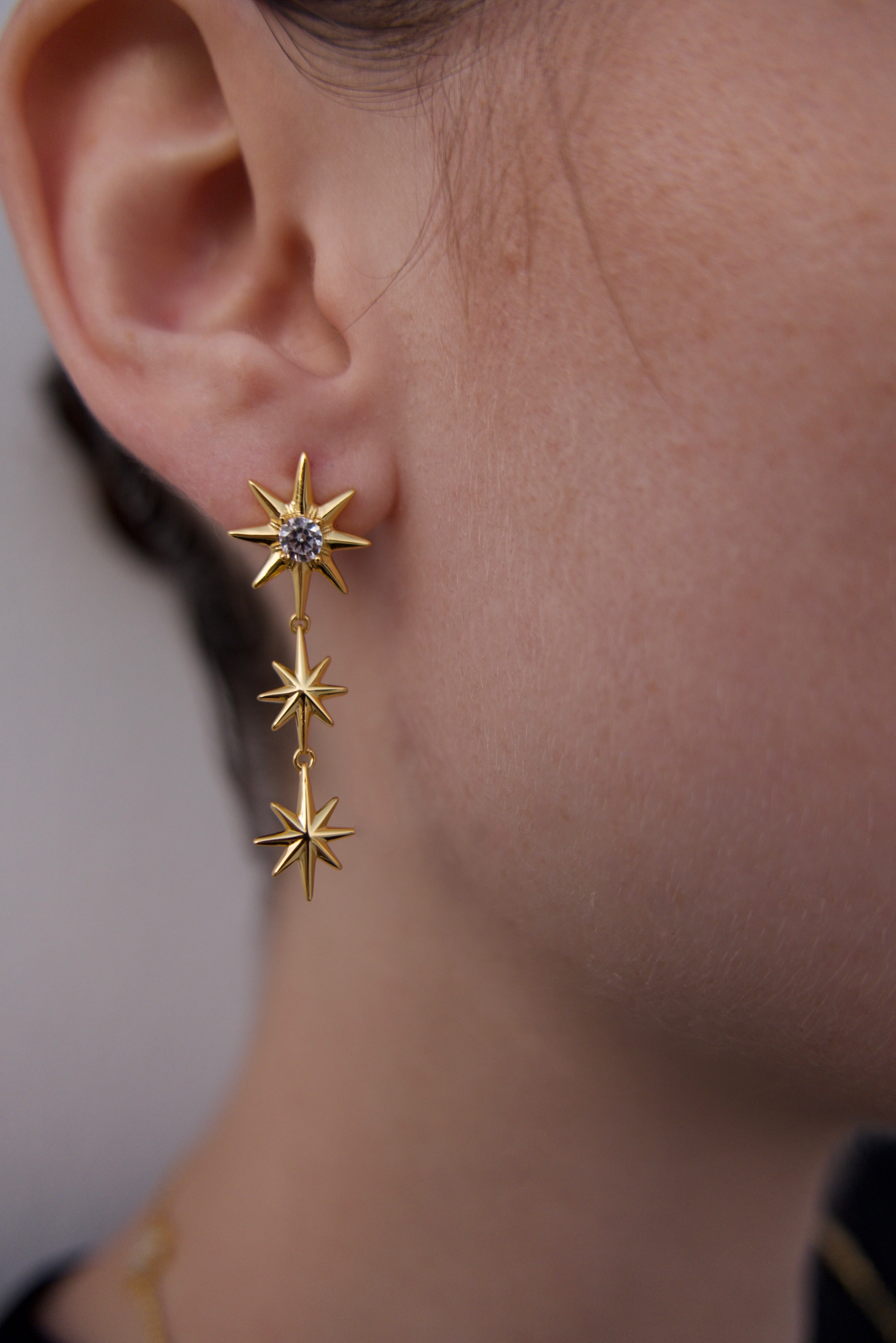 Each set features two different earrings, designed to complement yet contrast—one with cascading stars, the other more minimal and sharp. This asymmetry adds a unique character to your look, making Galaxies a true conversation piece.